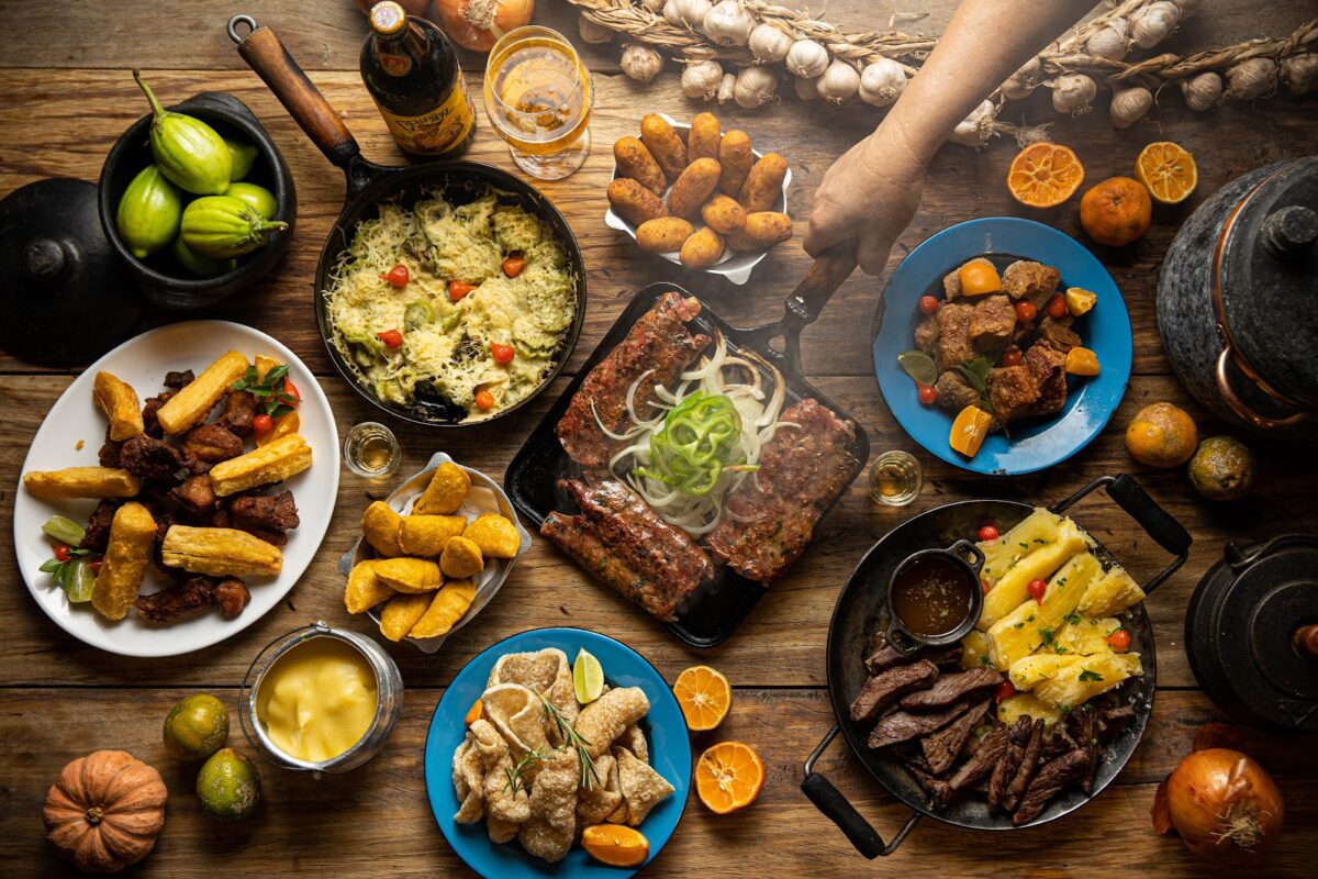 Porções e pratos típicos da cozinha mineira em casa rústica com decoração campestre, plantas e cozinha aberta.