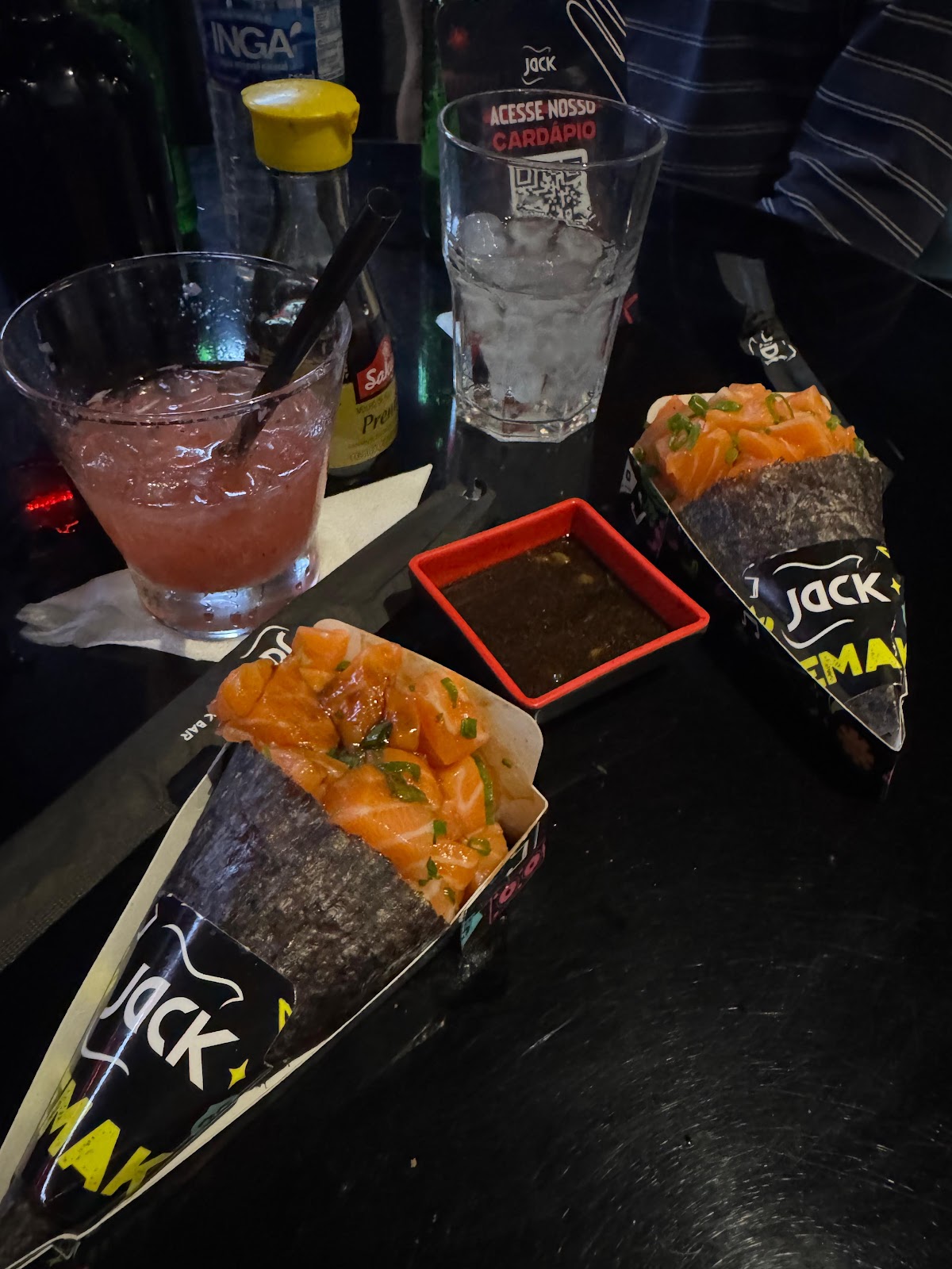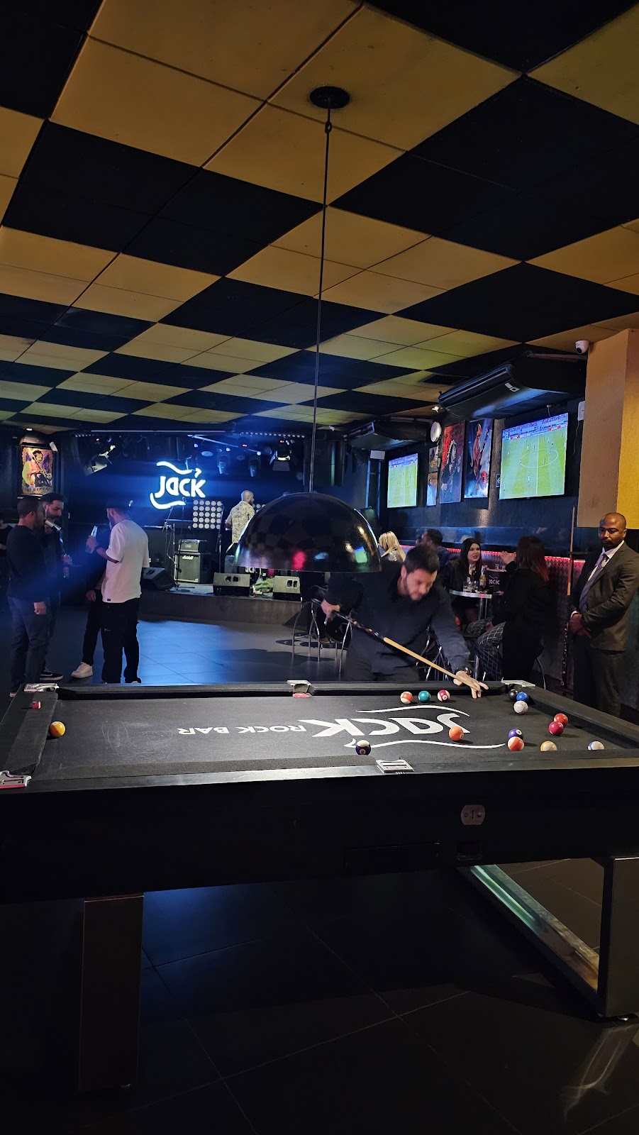 Rock ‘n’ roll ao vivo em um clube boêmio com pôsteres de bandas famosas, mesas de sinuca, TV e sushi.
