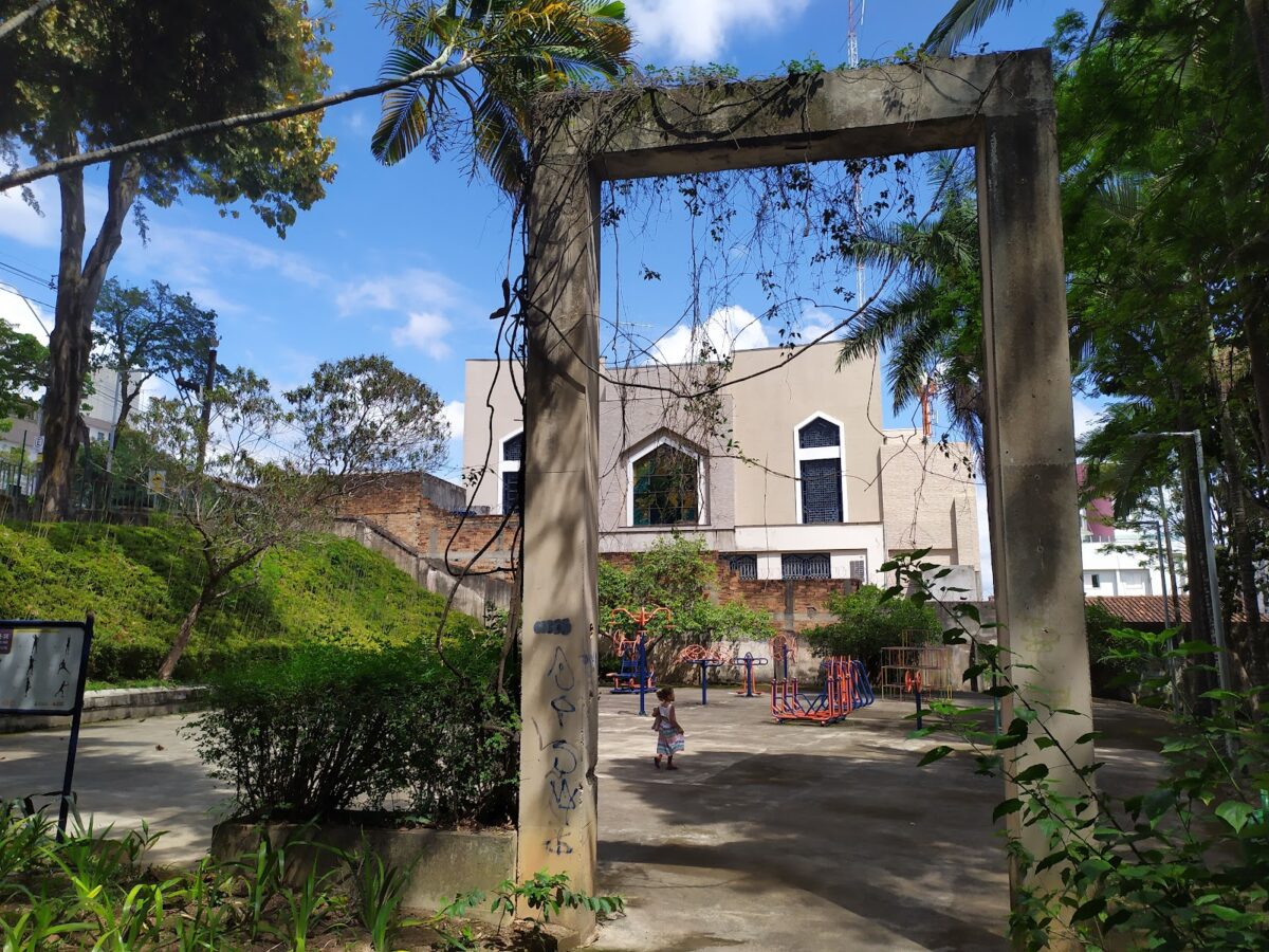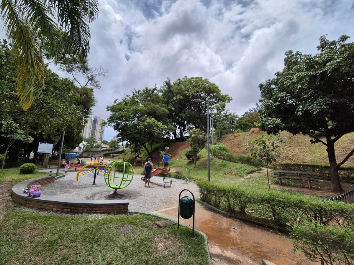 Parque urbano com playground, equipamento de ginástica e um anfiteatro, além de bancos e pistas de caminhada.