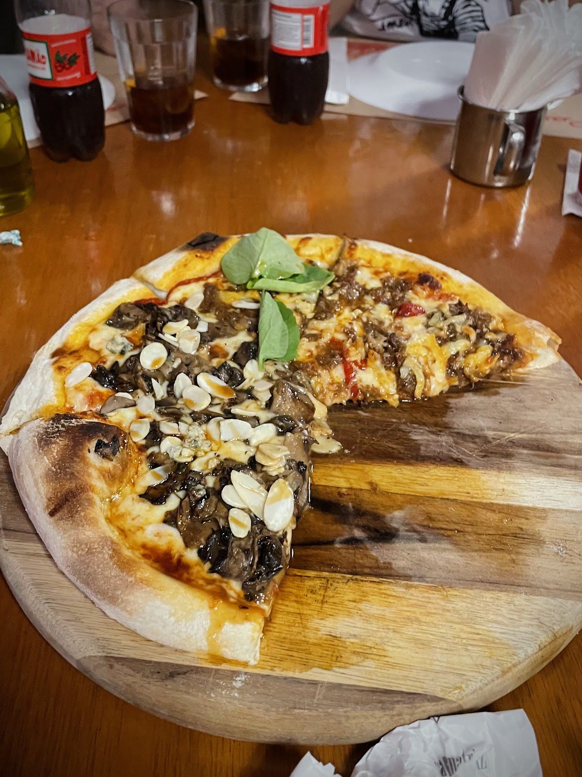 Pizza muito saborosa. Uma pizza dá perfeitamente para duas pessoas. Sabores incríveis e diferentões, vontade de provar todos. Dá pra ver o entardecer, vista agradável. Funcionários simpáticos e atenciosos. Voltarei com certeza. Preço justo pela qualidade oferecida.